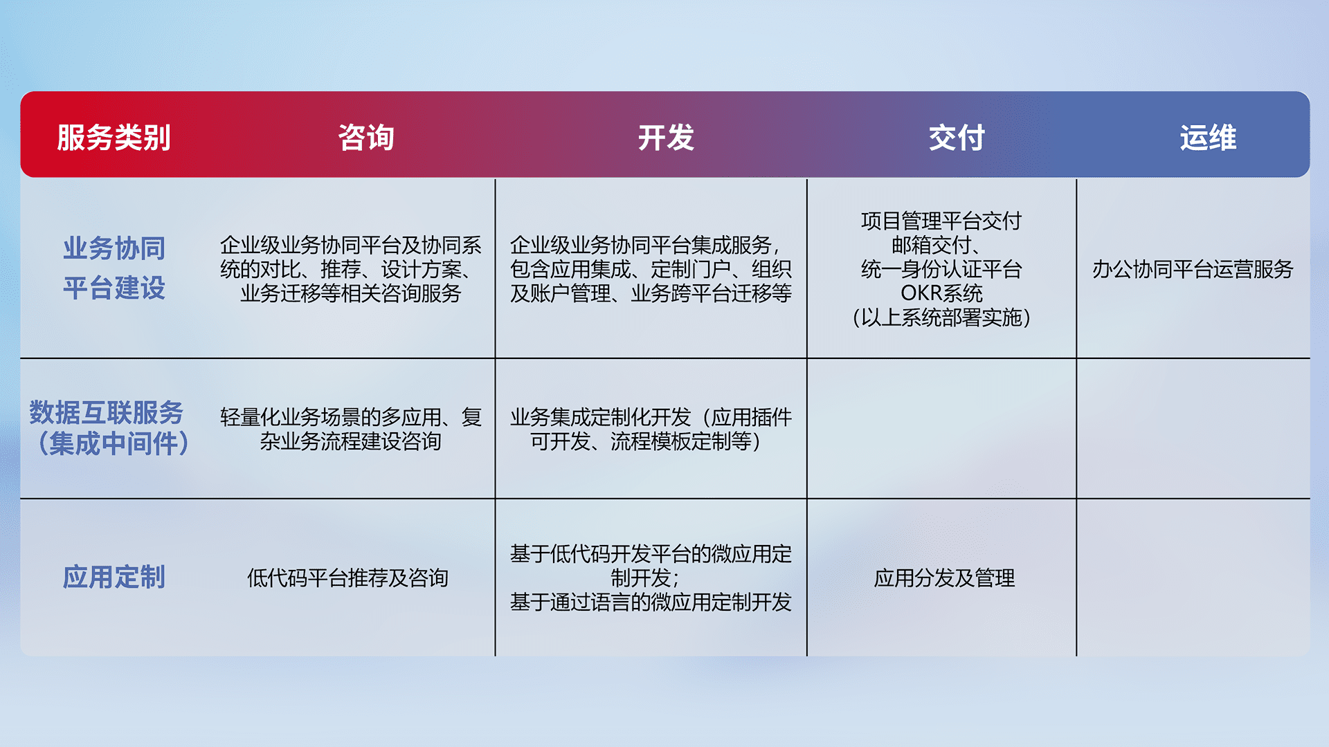 针对钉钉、、、、企微、、、、IDaas等平台级产品提供产品的规划、、方案、、、交付、、、、定制化开发等服务,,实现如统一协同办公、、、智能客户服务、、、、混合会议管理、、、智能数据查询、、、、等业务场景,,实现数字化转型。。。。
