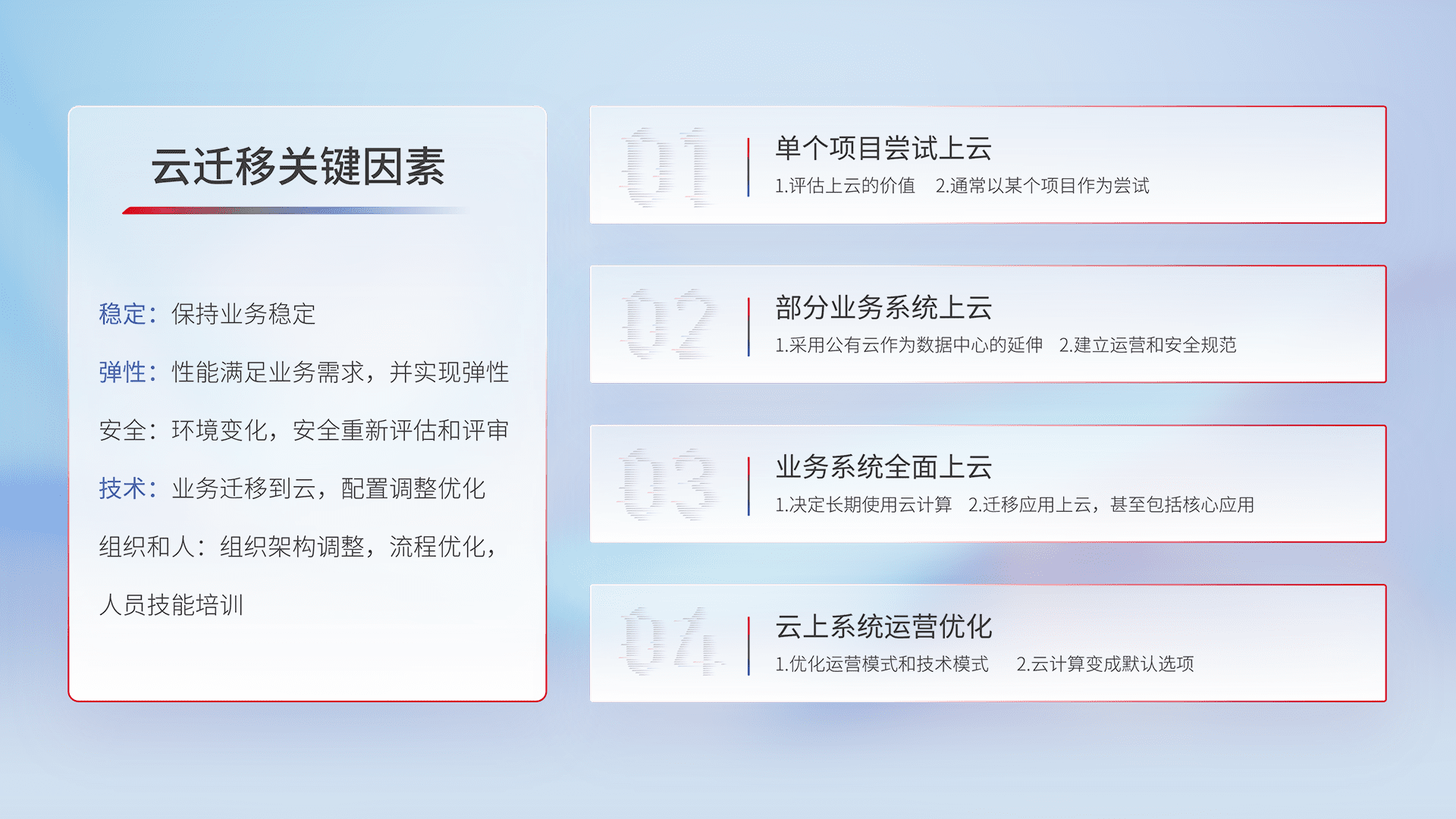 结合实际业务,,,,从规划设计、、、云平台选型、、云原生改造、、数据迁移、、、集成交付,,,,迁移全过程为客户识别最佳上云路径,,做好风险识别管理,,,设计网络架构、、身份权限、、、、安全审计合规、、操作审计、、日志审计、、、监控告警策略、、、多站点容灾设计等,,,对云上基础设施进行整体规划,,,,提升IT治理水平,,,以满足弹性、、、高可用、、、高性能的需求。。