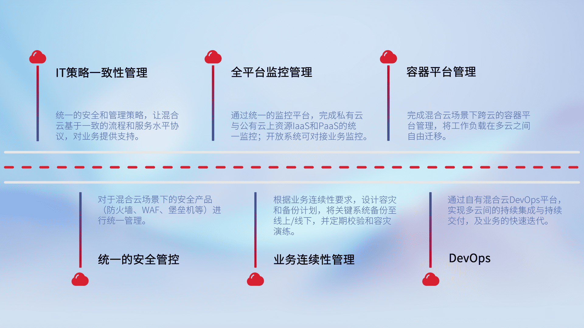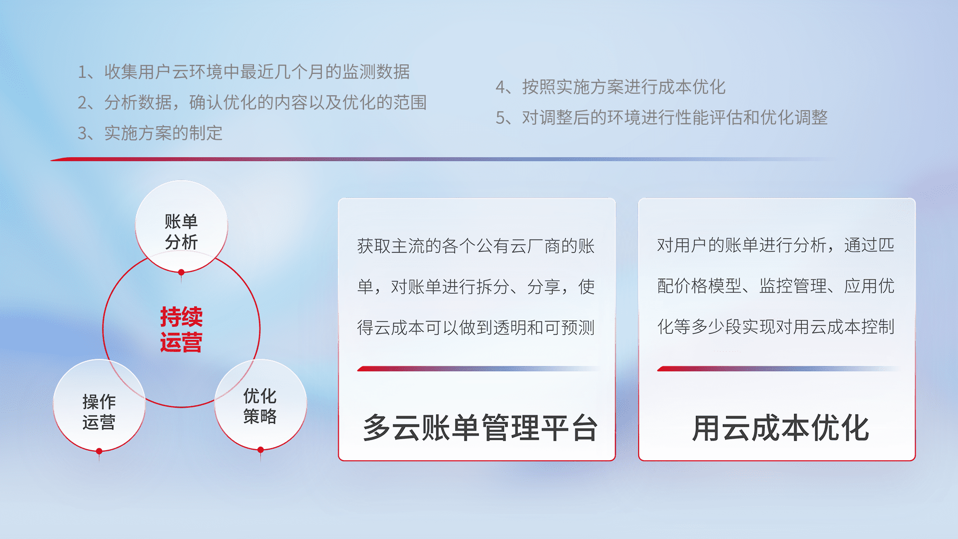 通过多云纳管,,,以统一的资源数据模型把客户的云资源进行抽象和封装,,,进而实现对多云资源的统一操作,,,,保障云资源管理的可靠性、、、、稳定性与可用性。。量身定制化运维内容,,,配置、、、开发运维、、、补丁管理、、、、备份、、监控、、、认证和访问管理、、审计和日常巡检等,,,,保障在用云过程中的可靠度,,,稳定度以及高可用率。。。